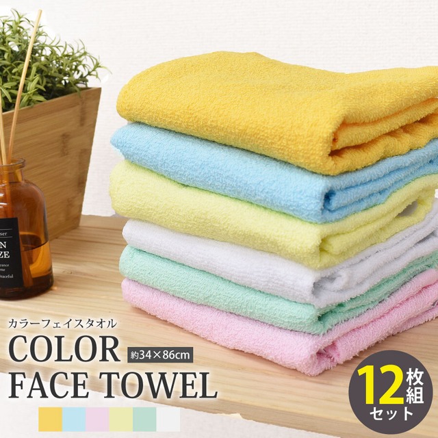フェイスタオル カラー 業務用 激安 12枚 セット 徳用 まとめ買い 無地 綿 コットン 白 青 黄色 緑 ピンク ゴールド 綿100 コットン100% めん100 パイル 丈夫 安い 旅行 エステ 美容室 台所 トイレ 幼稚園 保育園 粗品 ご挨拶 ギフト プレゼント 34 × 86cm